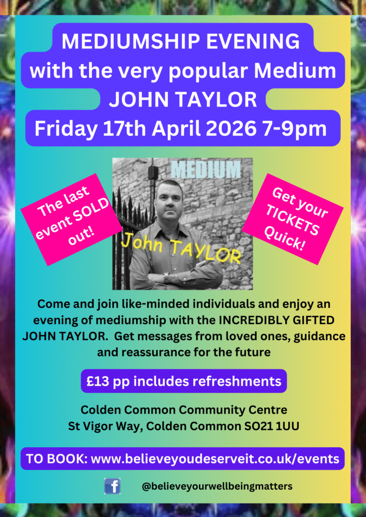 Come and join like-minded individuals and enjoy an evening of mediumship with the INCREDIBLY GIFTED JOHN TAYLOR. Get messages from loved ones, guidance and reassurance for the future.