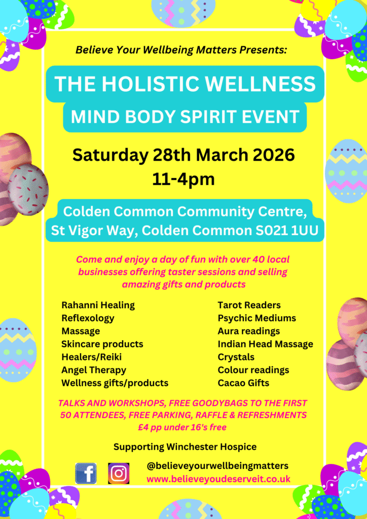 The MIND BODY SPIRIT Event returns to Colden Common on the 28th March for an Easter themed event with over 45 businesses attending, a raffle raising money for Winchester Hospice (with incredible prizes from local businesses) and refreshments, FREE parking and so much more!